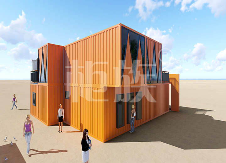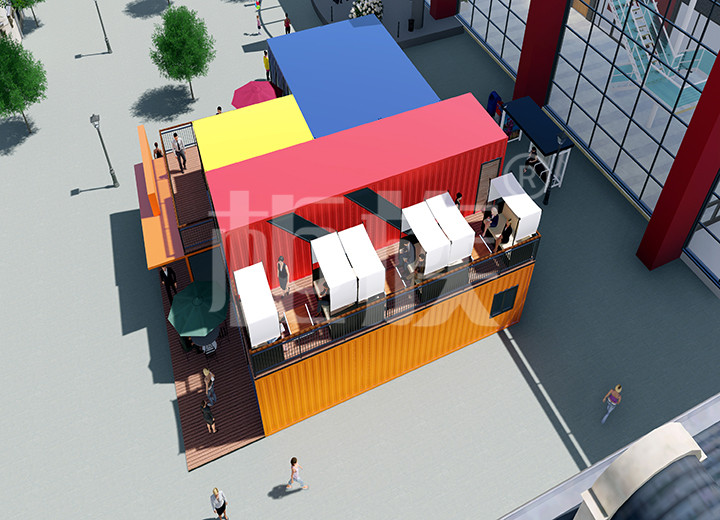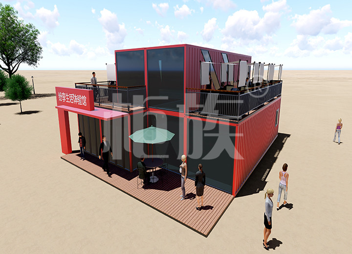 彩色外觀引人注目,集裝箱的隨意組合功能可以根據(jù)需要延展空間使用面積。一層可供展品擺放,二層陽臺可供休息娛樂。